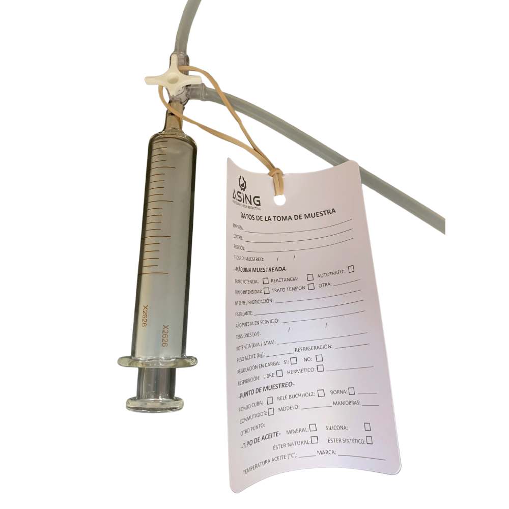 Jeringa de vidrio de 20ml con cierre “luer lock” llave de tres vías, latiguillos de silicona y etiqueta.